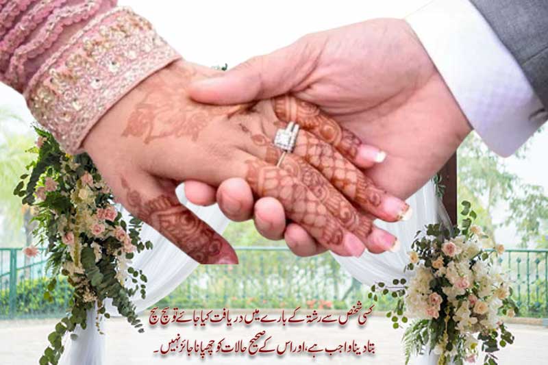 اور اس کے صحیح حالات کو چھپانا جائز نہیں ، اگر چہ کہ غیبت کی نوبت آجائے ؛ اس لئے سر پرستوں کا فریضہ ہے کہ وہ رشتوں کے بارے میں اچھی طرح تحقیق کرلیں اور کسی رشتہ کے سلسلہ میں رہنمائی کرنے والے اور مشورہ دینے والے پر واجب ہے کہ وہ کوئی بات چھپانے سے گریز کرے ، ورنہ عند اللہ گناہ ہوگا ۔