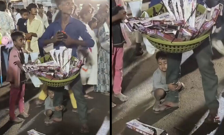 باپ کی خاموش قربانی، سڑک کنارے ہاتھوں میں کھلونوں کی ٹوکری اور قدموں سے لپٹا معصوم بچہ (ویڈیو وائرل)
