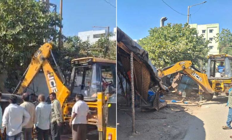 کوکٹ پلی میں تجاوزات ہٹانے کی مہم، نئے آر ٹی او دفتر کے قریب غیر قانونی شیڈس کو جی ایچ ایم سی اور ٹریفک پولیس نے صاف کر دیا، ٹریفک میں بہتری۔