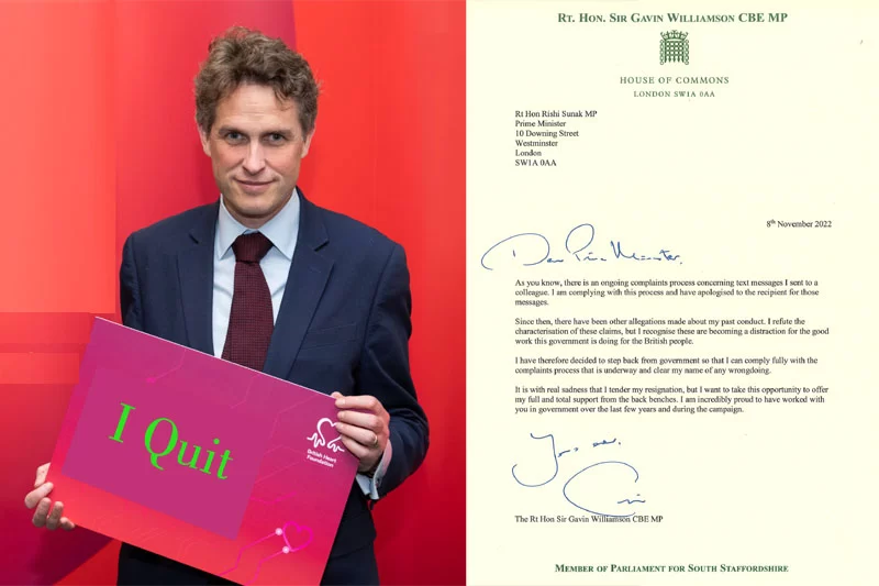 بی بی سی کی رپورٹس کے مطابق، ولیمسن پر گزشتہ ماہ ٹوری قانون سازوں کے ایک ساتھی کو توہین آمیز پیغامات بھیجنے اور وزیر دفاع کے طور پر سامنے آنے والے ایک سینئر سرکاری ملازم کو دھمکی دینے کا الزام عائد کیا گیا ہے۔