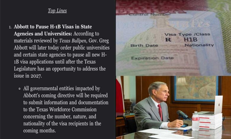 ٹیکساس: ٹیکساس کے گورنر گریگ ایبٹ نے ریاستی جامعات اور سرکاری اداروں کو ہدایت جاری کی ہے کہ وہ آئندہ سال تک H1B ویزا کے تحت نئی بھرتیاں روک دیں۔