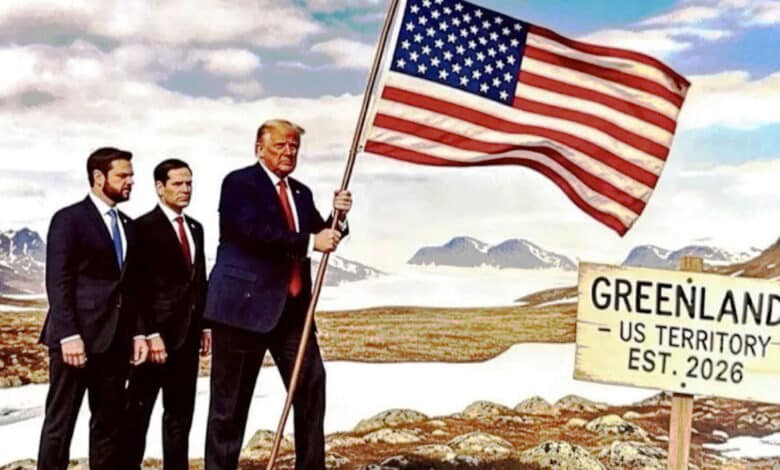 تصویر میں دیکھا جا سکتا ہے کہ مسٹر ٹرمپ گرین لینڈ کی زمین پر امریکی پرچم نصب کر رہے ہیں۔ تصویر میں اُن کے ساتھ نائب صدر جے ڈی وینس اور وزیر خارجہ مارکو روبیو کھڑے ہیں۔