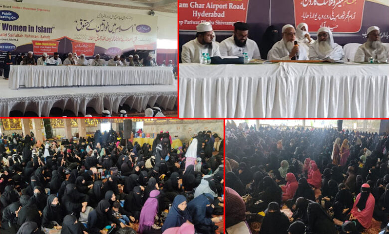 حیدرآباد: حیدرآباد میں شعبہ خواتین، آل انڈیا مسلم پرسنل لا بورڈ کی جانب سے 15 نومبر 2023 بروز چہارشنبہ، بمقام میٹرو کلاسک گارڈن، آرام گڑھ میں بعنوان "اسلام میں خواتین کے حقوق” پر ایک عظیم الشان جلسہ عام مولانا خالد سیف اللہ رحمانی صاحب، صدر پرسنل لا بورڈ کے زیر نگرانی منعقد کیا گیا۔